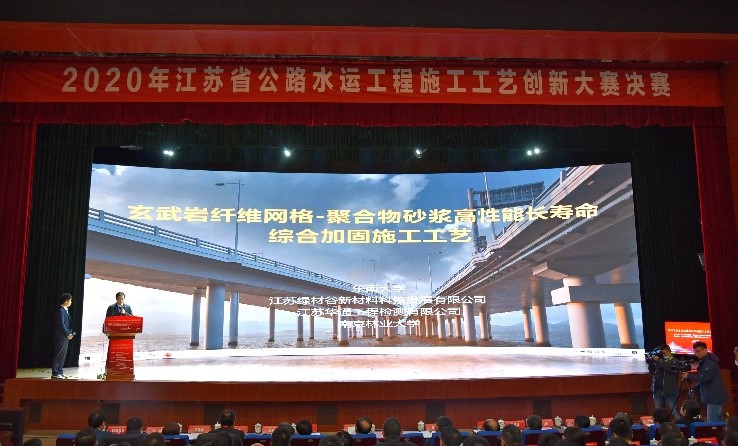 绿材谷科技主创团队汪昕在决赛陈述作品时表示,此次参赛工艺中使用的玄武岩纤维一体化成型网格是绿材谷科技研发的独家产品,目前已在南京长江大桥、沿海灌溉总渠大桥、常州南河桥等多个重大项目中得到应用。通过在混凝土构件表面铺设玄武岩纤维网格,并用高性能聚合物砂浆作为保护和粘结材料,使网格与原构件成为一个整体,共同承担荷载作用下的弯矩和剪力,以提高构件的承载力和使用性能。采用玄武岩纤维网格对梁、板、柱等构件进行加固,具有施工便捷、工期短、成本低、绿色环保等特点。评审专家组组长周海涛总工充分肯定了绿色高性能玄武岩纤维网格对旧桥加固的巨大作用。