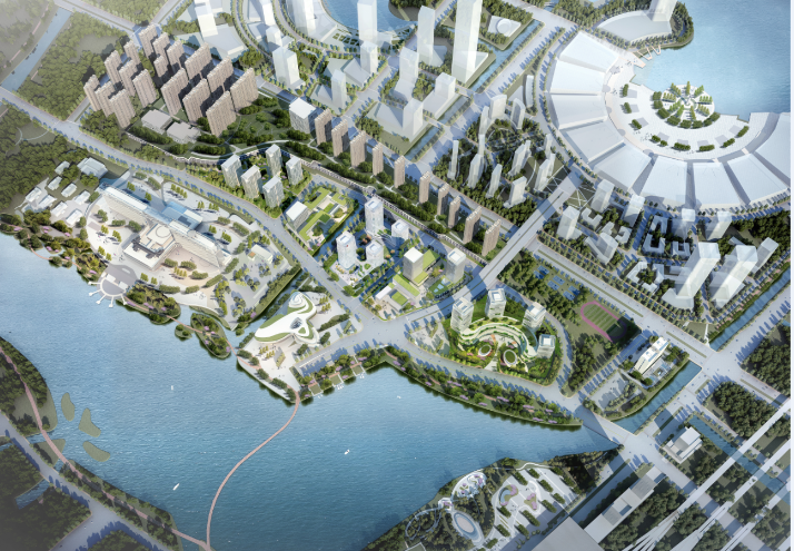 超新规划设计理念。总部基地项目采用四塔楼的布局方式,四栋塔楼分别位于场地街角处,塔楼间用办公空间或连廊进行连接,地面加入更多公共空间设计元素,营造多样化户外公共休憩场所。同时,利用开阔的场地,打造中央景观和出入口的景观轴线,堆山叠石、理水造园,设计的微缩园林,可眺、可观、可游,丰富内部空间体验。