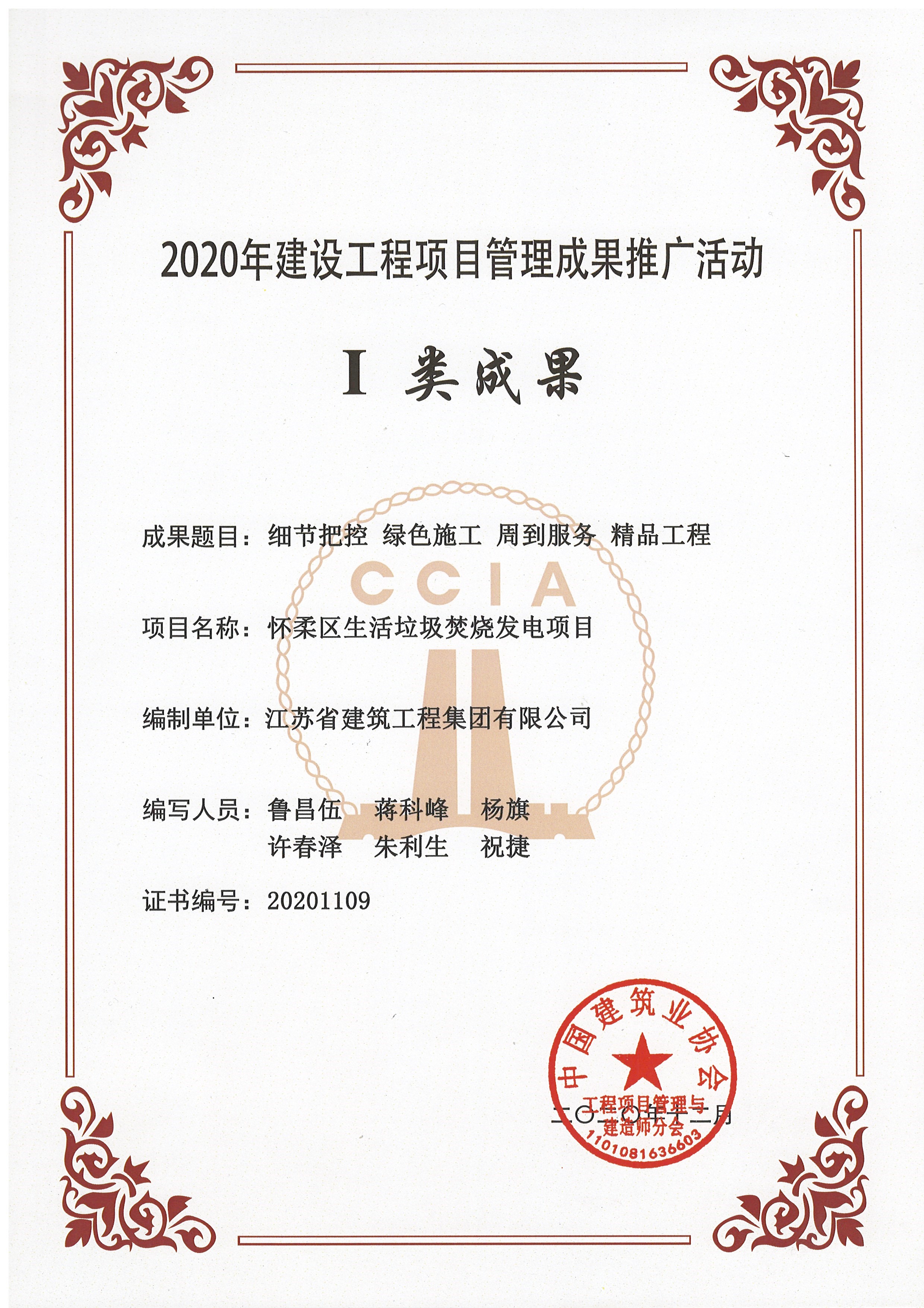 近日,集团“北京怀柔区生活垃圾焚烧发电项目”获得全国建筑业2020年建设工程项目管理一类成果。