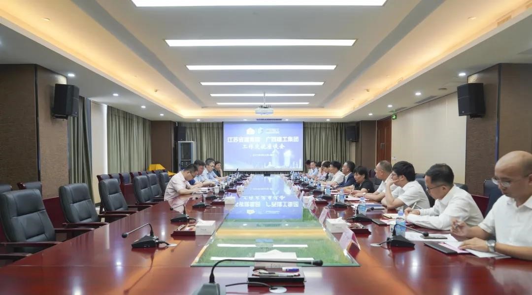 高宝俭对广西建工近年来取得的成绩表示高度肯定,并介绍了江苏省建五大产业板块、国内外市场业务布局以及信息化建设情况。他表示,广西建工与江苏省建同为绿地大基建成员企业,希望通过此次考察学习,实现优势互补、资源共享,共赢发展。