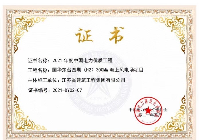 集团承建的国华东台四期(H2)300MW海上风电场项目位于江苏省盐城市,项目长约14km,南北宽约12km,离岸距离约42km,是目前国内离岸最远在建海上风电场,也是目前我国已投产发电离岸最远的海上风电项目。工程所在区域海况条件恶劣,存在无规律暗涌,加上受季风、突风、台风、寒潮等不利气象因素影响,对施工进度影响极大。针对难点问题,项目部根据施工现场状况,不断调整优化施工计划,解决了施工过程中诸多难题,确保了项目的顺利进行,也为工程创优奠定了坚实基础。中国电力优质工程奖是中国电力行业最高奖。