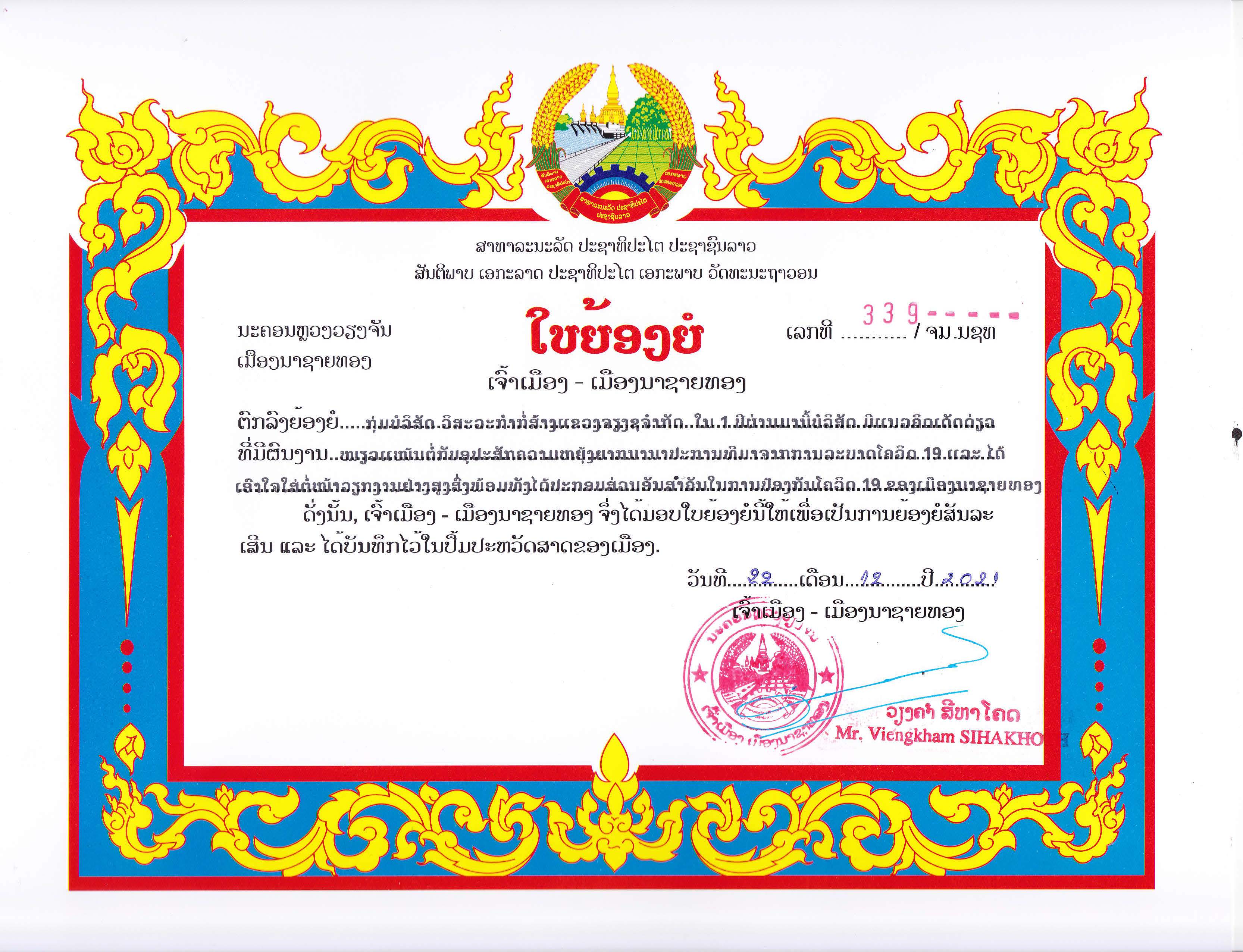 “同呼吸、共命运、心连心,我们永远在一起”捐赠活动暨援老挝万象纳赛通中学项目表彰仪式1月11日在老挝万象市纳赛通县政府举行。纳赛通县委书记兼县长温康•西哈阔、县委副书记兼县监察局主席蒲翁•皮特、县委副书记本苏•帕维素、副县长普翁•鹏拉乔等出席。万象市电视台全程报道。
