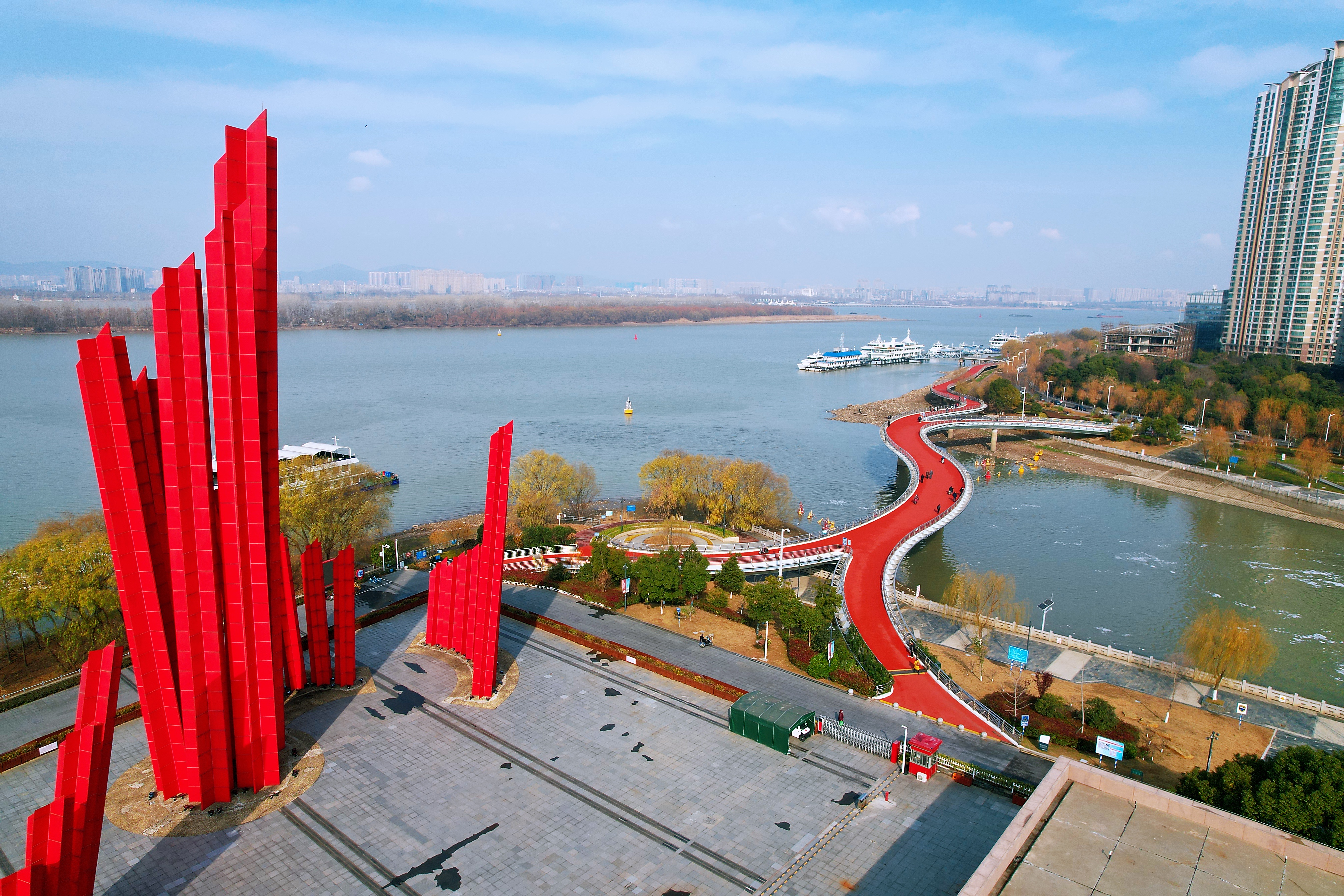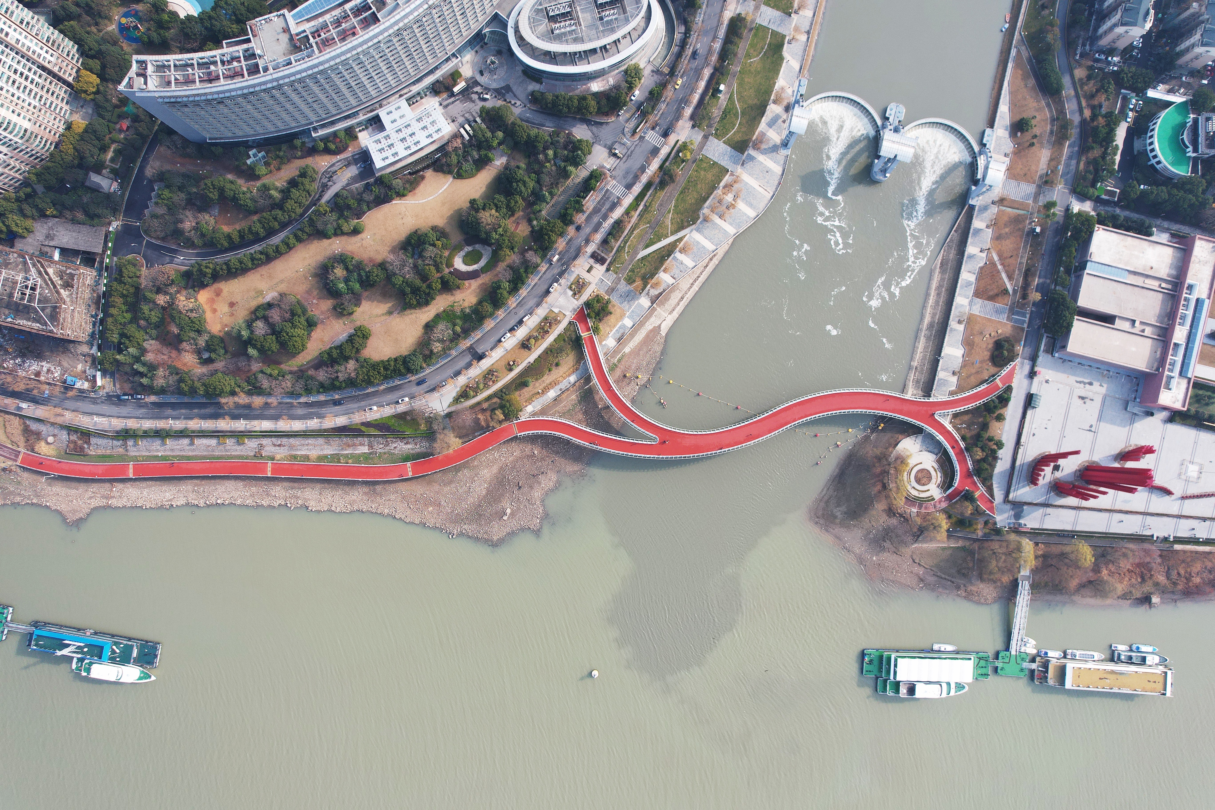 █红色桥面宛若祥云飘落在入江口