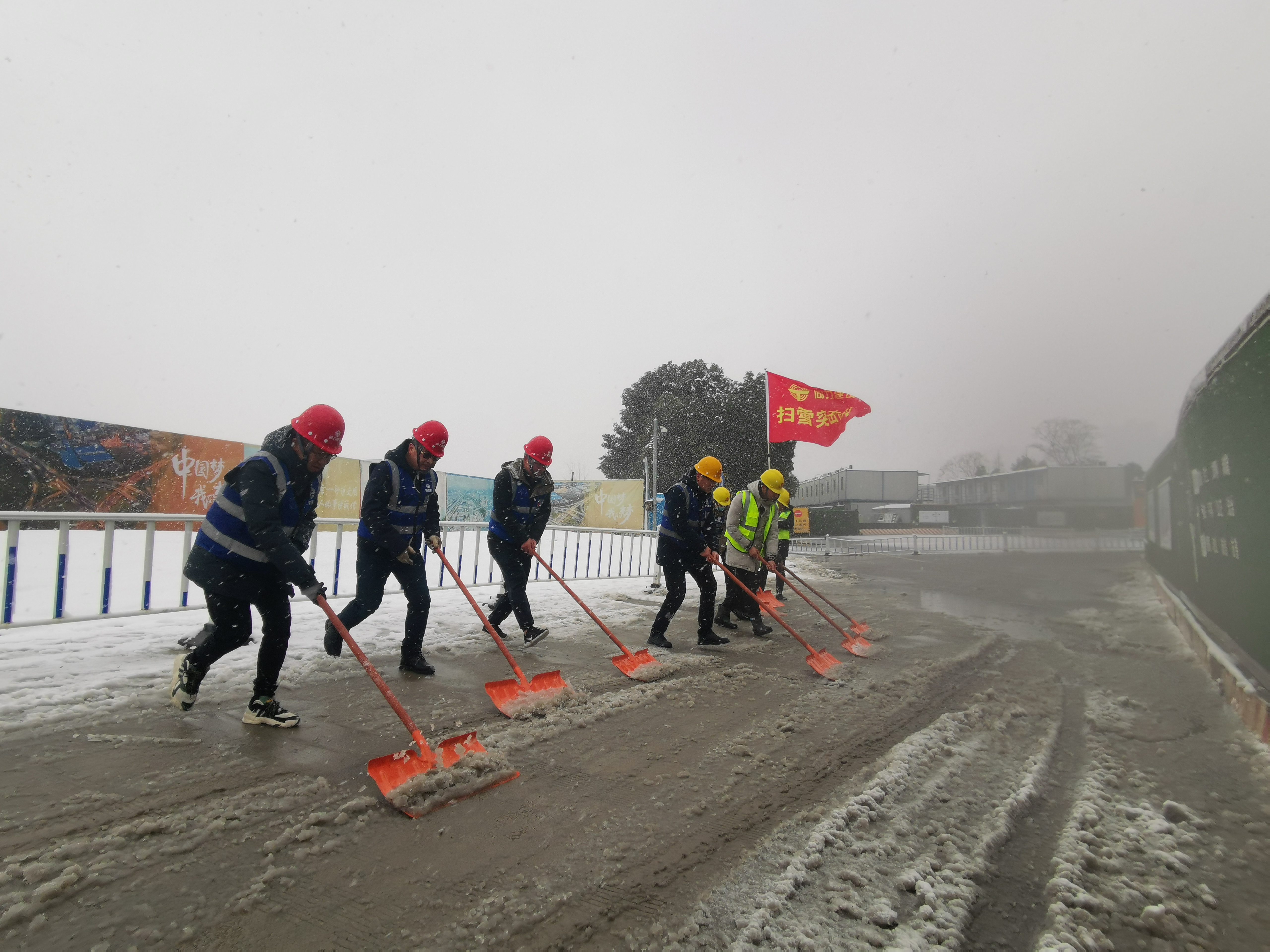 地铁5号线项目部按照事先制定的扫雪防冻方案要求,组织项目部管理人员及部分盾构工人,对项目部周边道路扫雪融冰,确保人员车辆通行。