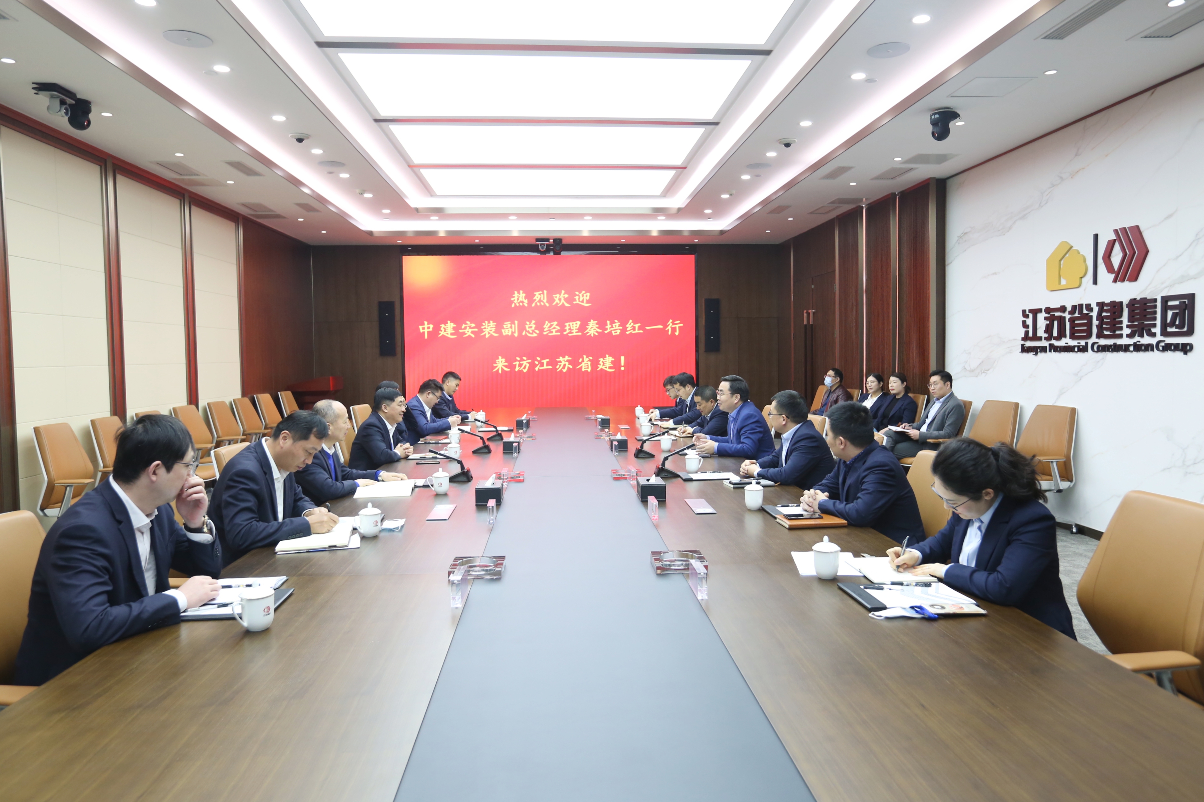 秦培红对蒋宁的热情接待表示感谢,高度评价了江苏省建改革发展所取得的一系列成绩,并介绍了中建安装改革历程、产业结构以及经营现状。他表示,江苏省建连续多年位列江苏省建筑外经企业首位,成为中国建筑业“走出去”发展的标杆,双方在国际承包工程领域有着丰富的合作机会,希望在今后的工作中,与江苏省建充分发挥各自优势,加强沟通,实现合作共赢。